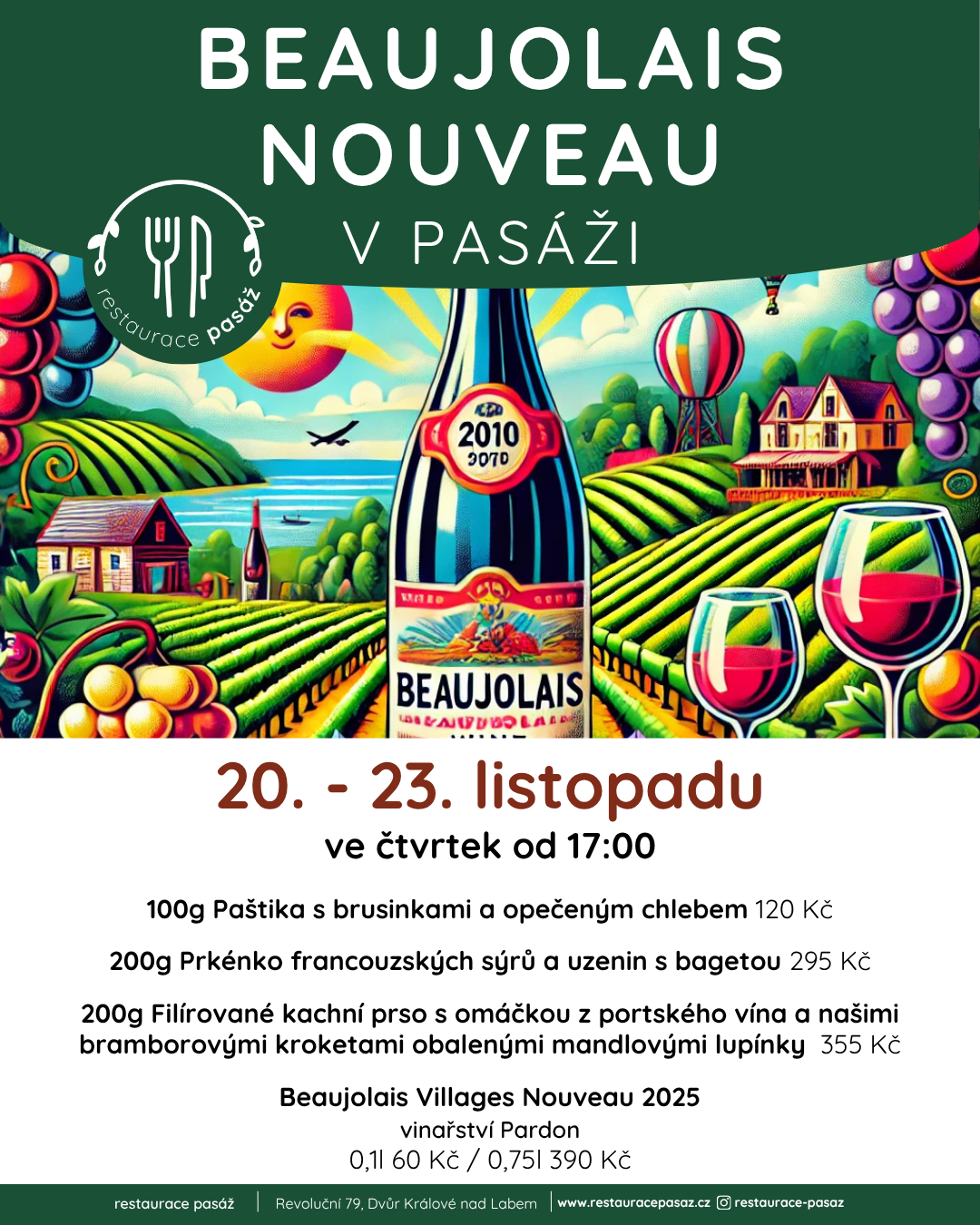 20.–23. listopadu vás zveme do Restaurace Pasáž na tradiční slavnost mladého vína – Beaujolais Nouveau!