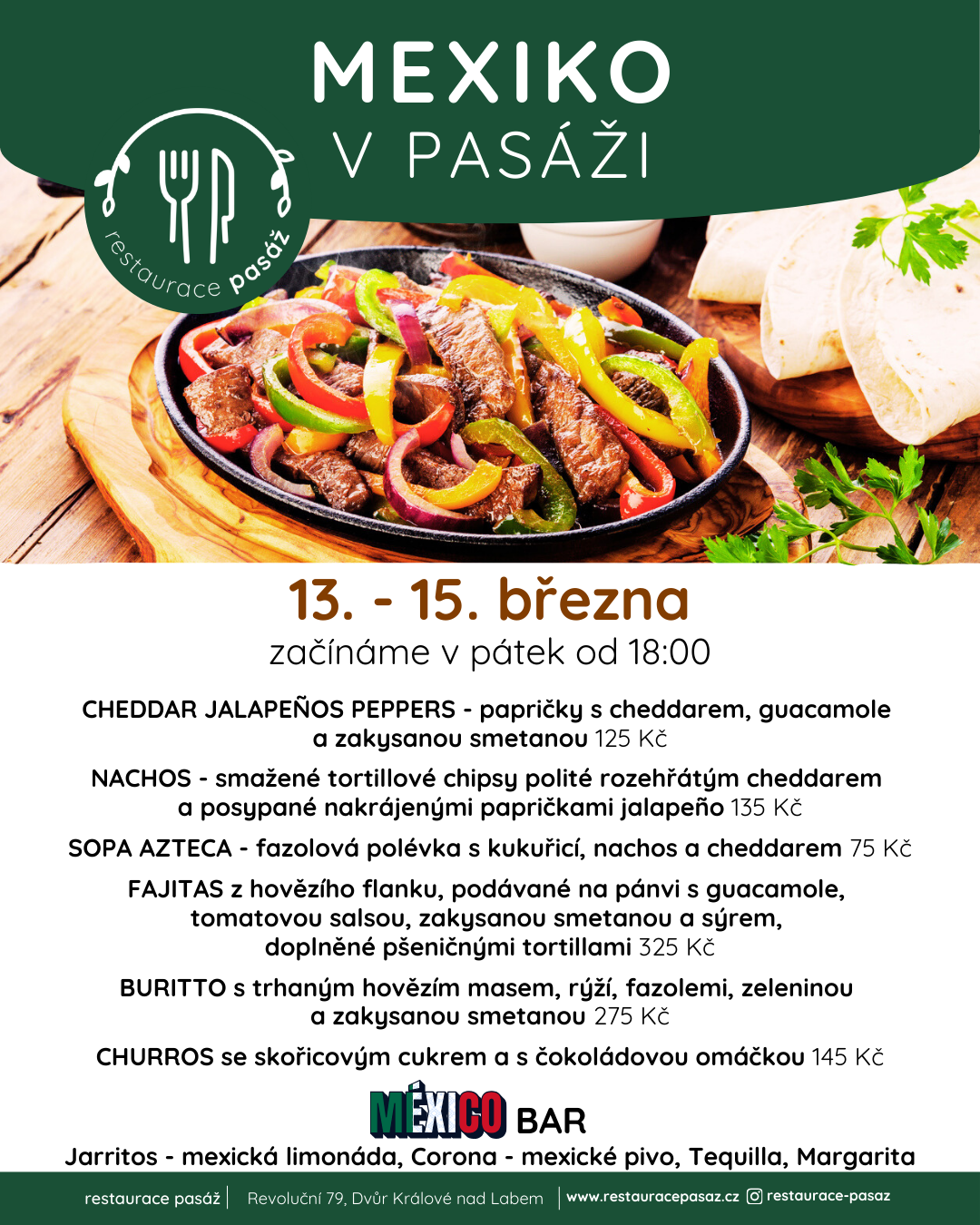 Od pátku 13. března (start v 18:00) do neděle 15. března vás zveme na tematický mexický víkend plný autentických chutí.